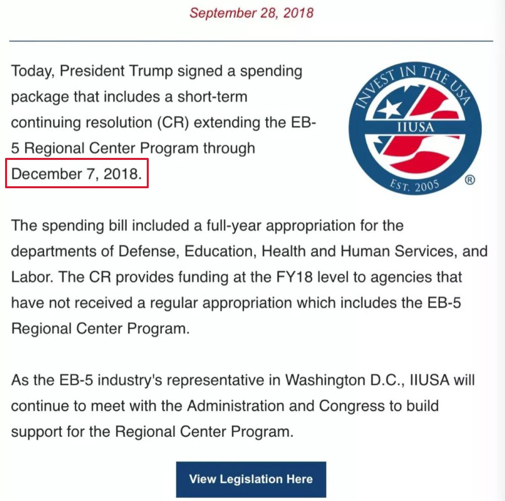 当地时间9月18日,美国参议院以93:7投票通过临时预算案。9月26日,美国众议院以361:61投票通过。9月28日,川普签署该法案,EB-5获延期至2018年12月7日。之后,签证公告板上显示的“U”(无签证名额)则会变成签证排期日,除了中国(签证排期日2014年8月15日)和越南(签证排期日2016年1月1日)以外,其他国家的排期将显示为“current”(有签证名额)。