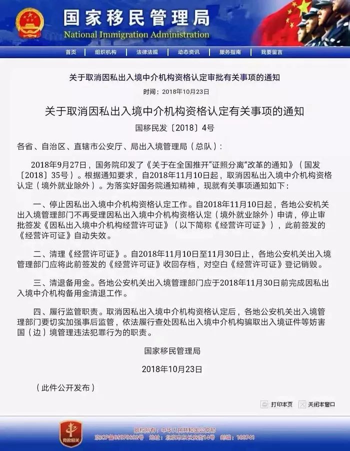 10月23日,国家移民管理局发布通知:自2018年11月10日起,各地公安机关出入境管理部门不再受理因私出入境中介机构资格认定(境外就业除外)申请,停止审批签发《因私出入境中介机构经营许可证》。也就是说,移民中介牌照将彻底在全国范围内放开。取消移民中介牌照的前期资格认证审查,相关部门将会更加注重事后监管。对于申请人而言,谨慎挑选更专业、实力更强、口碑更佳的移民咨询公司,才能更有效地避免移民申请过程中的一系列问题。
