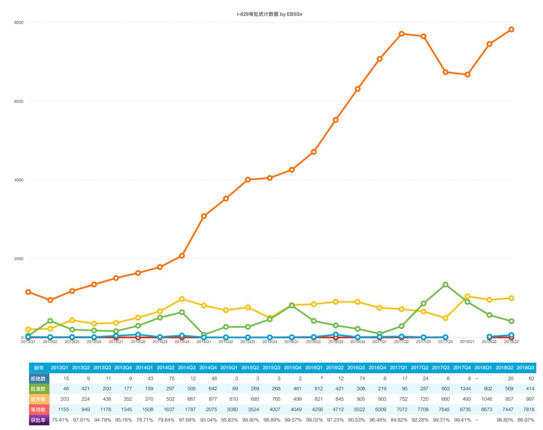 再来看看I-829,这一季度:申请数为997,比上一季度增加了40;审批数为414,比上一季度减少了155;拒件数为62,比上一季度增加了42;积压数为7,818,比上一季度增加了371。