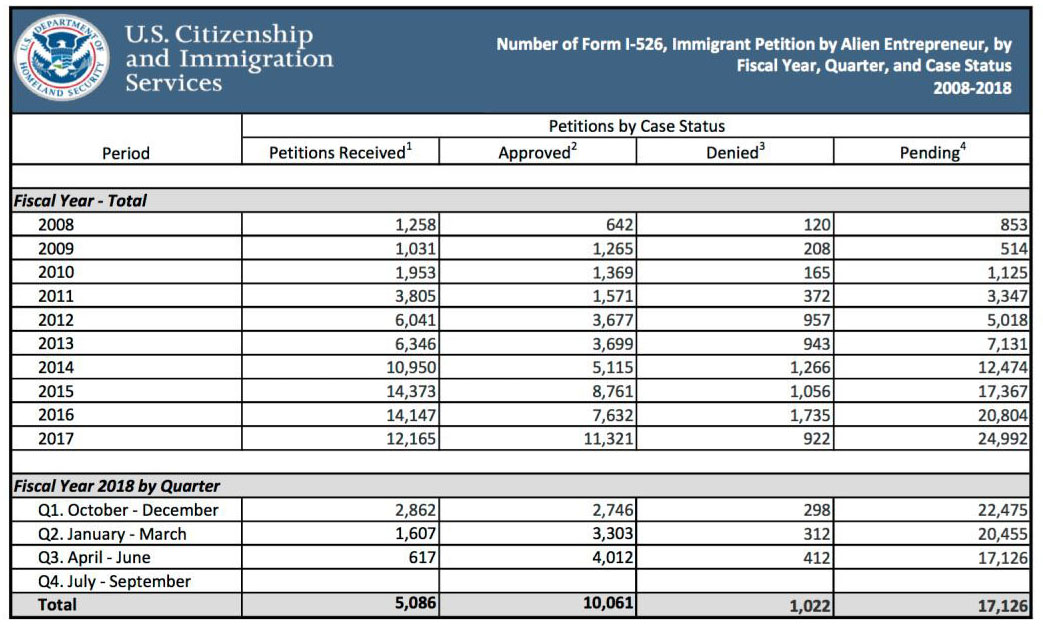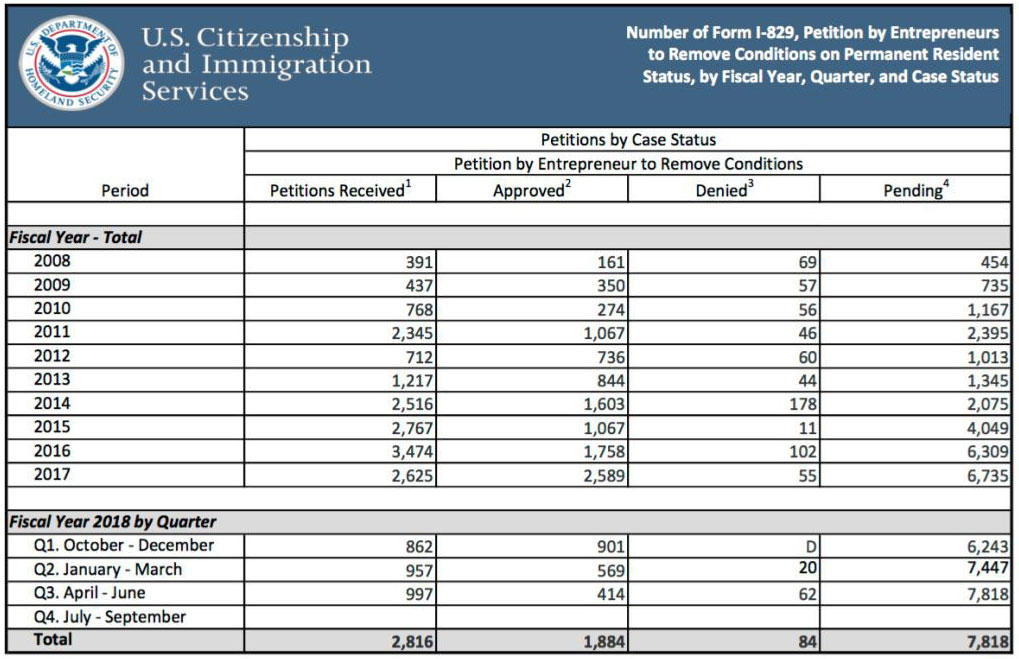 11月1日, 局公布了2018财年第三季度(2018年4月1日至6月30日)的EB-5案件递件和审批数据。I-526审批数据:(1)申请数为617,比上一季度减少了990;(2)审批数为4,012,比上一季度增加了709;(3)拒件数为412,比上一季度增加了100;(4)积压数为17,126,比上一季度减少了3,329。I-829审批数据:(1)申请数为997,比上一季度增加了40;(2)审批数为414,比上一季度减少了155;(3)拒件数为62,比上一季度增加了42;(4)积压数为7,818,比上一季度增加了371。