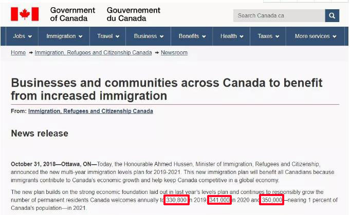 当地时间10月31日,加拿大联邦移民部公布了新的移民配额计划:2019年为33.08万人,2020年为34.1万人,2021年增加至35万人。即未来三年加国计划吸纳的移民总数为102.18万人。根据该计划,加拿大此次吸纳新移民包括:经济类移民、家庭团聚类移民以及难民。其中大多数将会是经济移民,约占总数58%。这些移民需通过各种特别经济项目的审批,以便更好的适应加拿大劳动力市场的需要,建设充满活力和包容性的社区。