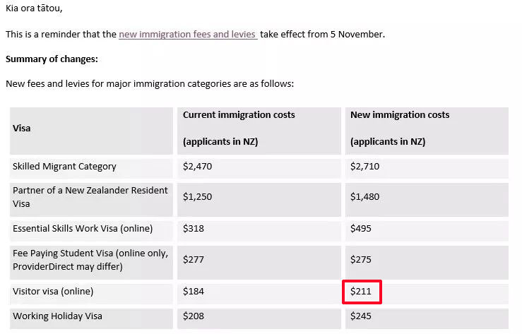 新西兰签证中心近日发布通告:自2018年11月5日起,新西兰各签证费用将全面上涨,移民局所征收的新签证申请费及税费将生效。新西兰移民局列出来一些申请得比较多的签证类型,其中,在线申请旅游签证费用将从165纽币涨到211纽币(按照目前汇率大概涨了211元人民币)。