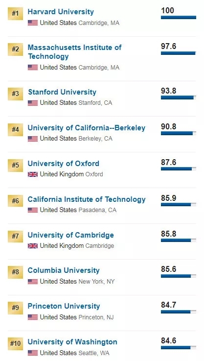 10月30日,美国U.S.News 发布了2019年世界大学排名,共有1250所大学上榜。在Top100中,美国46所,英国12所,澳大利亚7所,加拿大3所,中国大陆2所。清华大学冲进Top50,北京大学位列第68;法国巴黎萨克雷大学首次冲进世界大学排名前列,位居30。世界排名前十的大学依然被英美两国所垄断,波士顿的哈佛和MIT继续着同城竞争,旧金山附近的斯坦福和伯克利相爱相杀,而历史渊源颇深的牛津和剑桥紧随其后。与英国的泰晤士排名把牛津、剑桥放在前两位不同的是,美国人当家作主的US News第一、第二、第三、第四的大学都是Made in the USA。