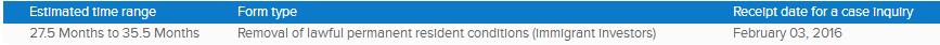 •I-829预计审案时间为27.5-35.5个月,案件查询日期为2016年2月3日。