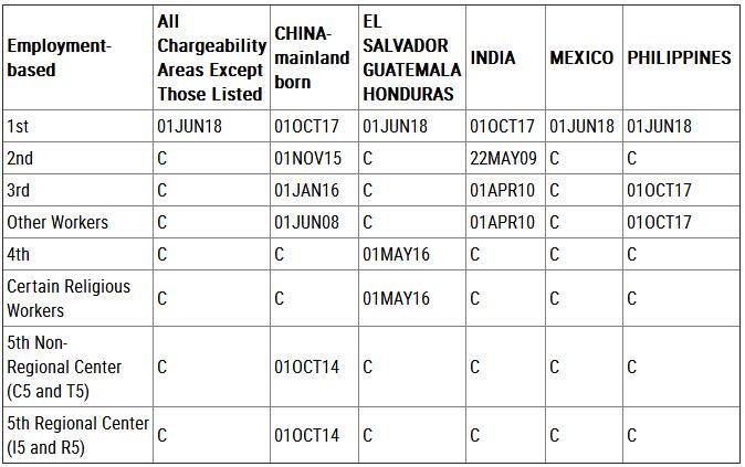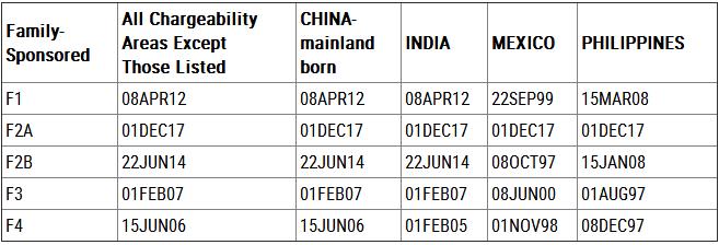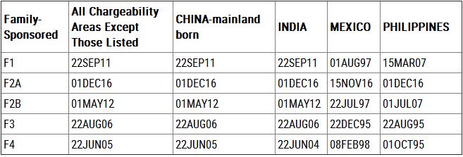 中国大陆出生申请人,EB-1由2016年12月15日前进至2017年2月8日;EB-2由2015年8月1日前进至2015年10月1日;EB-3由2015年6月8日前进至2015年7月1日;EB-4有名额;EB-5维持在2014年9月1日。