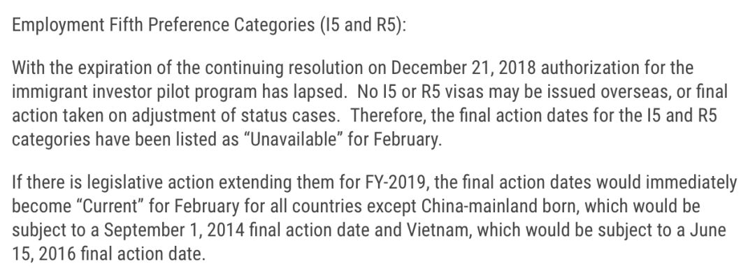 由于EB-5区域中心法案已经随着联邦政府的临时预算案未获延期,到2018年12月21日就已经暂停了,现在还不知道川普和民主党何时能够妥协,通过联邦政府预算案,使得EB-5区域中心计划能够顺带延期。所以,国务院签证办公室同时公告如下: