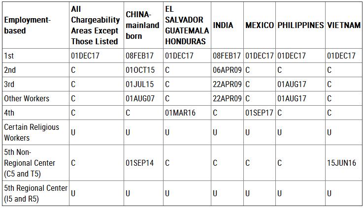 1月12日,美国国务院签证办公室发布了2月的签证排期公告,EB-5签证排期截止日停留在2014年9月1日,表B则维持在2014年10月1日。亲属移民“绿卡批准排期”,中国申请人的情况为——F-1类:由2011年8月22日前进至2011年9月22日;F-2A类:由2016年11月8日前进至2016年12月1日;F-2B类:由2012年3月15日前进至2012年5月1日;F-3类:由2006年8月15日前进至2006年8月22日;F-4类:由2005年5月22日前进到2005年6月22日。职业移民“绿卡批准排期”,中国申请人的情况为——中国大陆出生申请人,EB-1由2016年12月15日前进至2017年2月8日;EB-2由2015年8月1日前进至2015年10月1日;EB-3由2015年6月8日前进至2015年7月1日;EB-4有名额;EB-5维持在2014年9月1日。