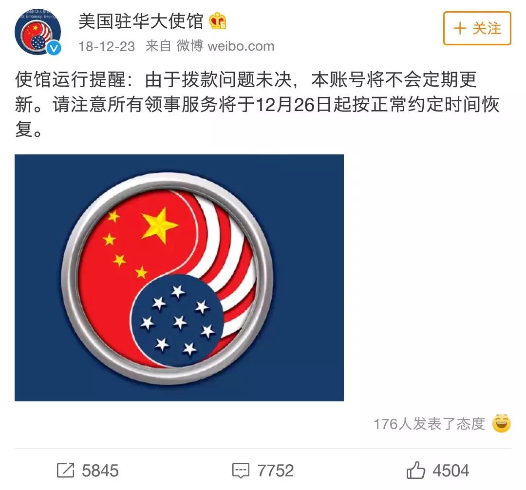 国会两党依然僵持不下,这意味着数以万计的联邦雇员只能停工,大量的政府职能都要暂停,其中就包括……定期更新美国驻华大使馆的微博和微信公众号。2018年底政府一关门,美国驻华大使馆官方网站就发布运行提醒,称由于拨款问题未解决,社交媒体推送不会定期更新。