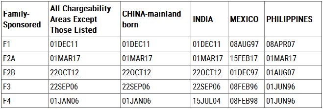 3月14日,美国国务院签证办公室发布了4月的签证排期公告,EB-5签证排期截止日前进一周至2014年9月15日,表B则前进一周至2014年10月8日。亲属移民“绿卡批准排期”,中国申请人的情况为——F-1类:由2011年10月22日前进至2011年12月1日;F-2A类:由2017年1月8日前进至2017年3月1日;F-2B类:由2012年8月1日前进至2012年10月22日;F-3类:由2006年9月8日前进至2006年9月22日;F-4类:由2005年9月22日前进到2006年1月1日。职业移民“绿卡批准排期”,中国申请人的情况为——中国大陆出生申请人,EB-1保持在2017年2月22日;EB-2由2016年1月1日前进至2016年4月1日;EB-3由2015年7月8日前进至2015年8月1日;EB-4有名额;EB-5由2014年9月8日前进至2014年9月15日。