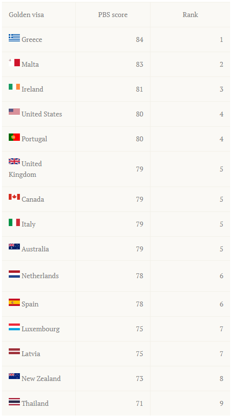Best Citizenship网站近日发布了2019年全球最佳“黄金签证”(Golden Visa)排名,在这份榜单中,希腊荣获第一。“黄金签证”是欧债危机以来,欧洲国家推出的一项“吸金”政策。允许外国人通过投资置业等方式获得本国居留许可,甚至是公民身份。因此,近年来以希腊、爱尔兰、马耳他为代表的办理速度快、投资门槛低等购房移民项目,在移民市场炙手可热。