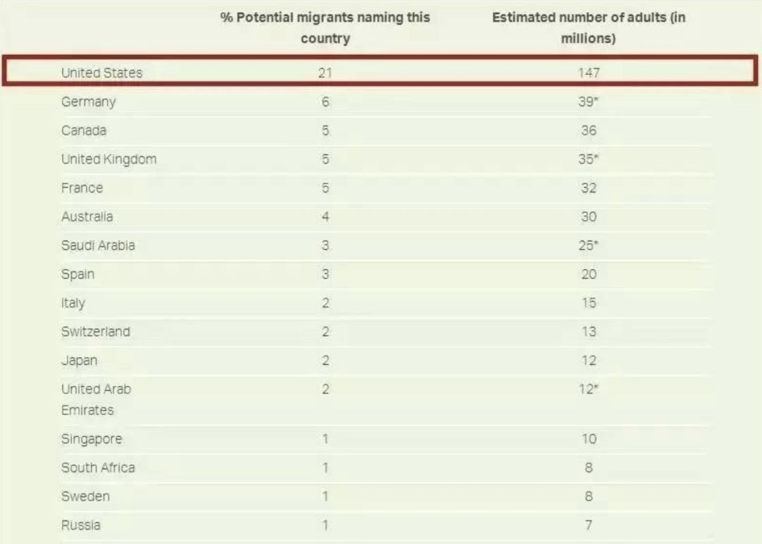 “自从盖洛普十年前开始跟踪这些调查,美国就一直是潜在移民的首选之地。潜在移民中的五分之一,也就是1.47亿人愿意到美国生活”。盖洛普的分析结论如是说。