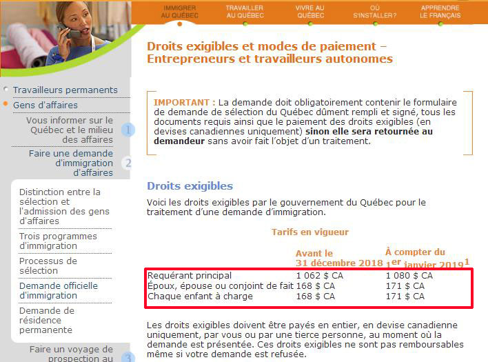 从2019年1月1日起,魁省移民局申请费用实行新的收费标准,具体内容如下:(1)魁省投资移民申请费将从15235加币上调至15496加币;(2)魁省企业家移民、自雇移民申请费,主申请人费用将从1062加币上调至1080加币,随行配偶及孩子费用将从168加币上调至171加币。