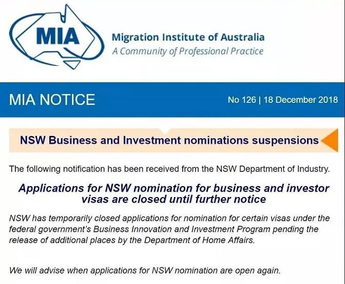 当地时间12月18日,澳洲新南威尔士州政府通知:暂停所有商业移民申请,新开放的日期目前不能确定,具体情况等待新南威尔士州政府的进一步通知。此次关闭的州担保申请的签证类别包括:188A商业创新类移民、188B商业投资类移民、188C SIV重大投资者签证、188E创新企业家移民、132A天才企业家移民、132B风险投资家移民。另外,转永居的888、892、893签证仍然可以继续申请,不受影响。