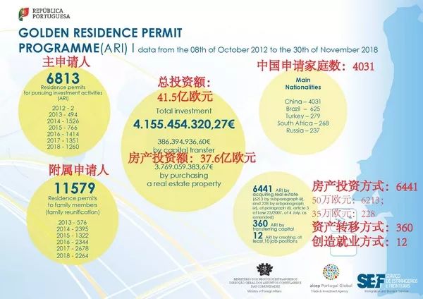 葡萄牙移民局(SEF)官方发布了截止到2018年11月30日黄金居留获批的最新数据。(1)累计投资额:目前为止,葡萄牙黄金居留许可项目总投资额约为41.55亿欧元,其中房地产贡献约为37.69亿欧元。(2)主申获批人数:11月份有126位主申请人获批,累计总共6813位投资人成功获批黄金居留许可。(3)附属申请人数:11月份有209位附属申请人成功获批,黄金居留许可累计附属申请人数为11579人。(4)投资者来源:在目前6813位获批的投资者中,中国有4031人(占比约60%)。