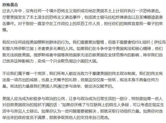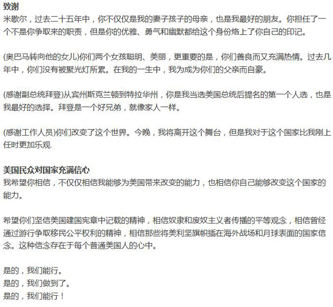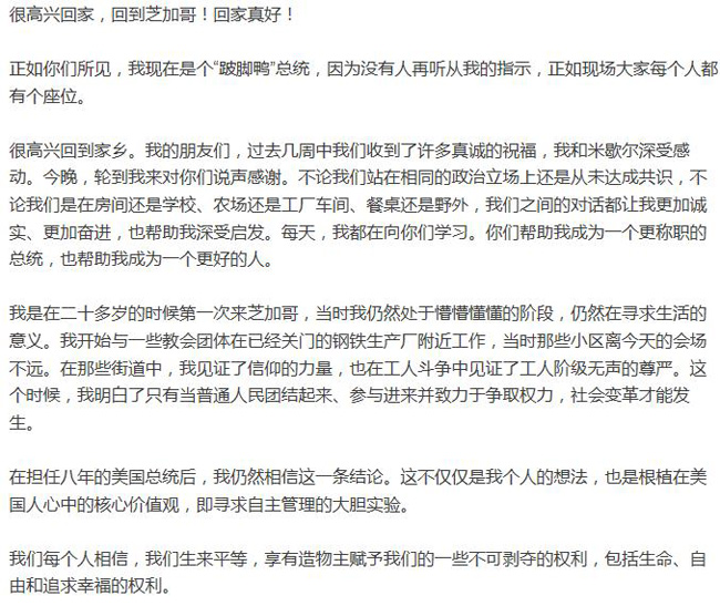 美国东部时间2017年1月10日晚9点,第44任总统奥巴马在芝加哥向美国人民发表告别演说,这是其在离任前最后一次发表公开演讲,也被白宫称为“向前看”的演说。
