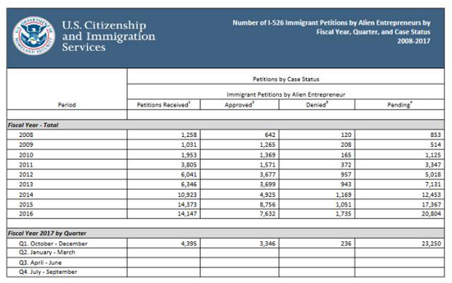 在2017财年第一季度,I-526申请数继续保持高位,930大限之后的12.9,美国国会继续成为EB-5疾驰的最大推手。