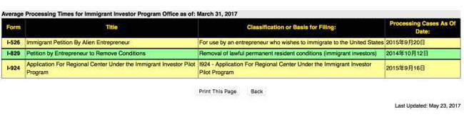 美国分公司收到消息,当地时间5月23日, 局在其官方网站更新了截止到2017年3月31日的最新EB-5审案进度表。好消息是,比起2月份,3月份的审批进度:I-526前进11天,I-829前进11天,I-924前进一个月!