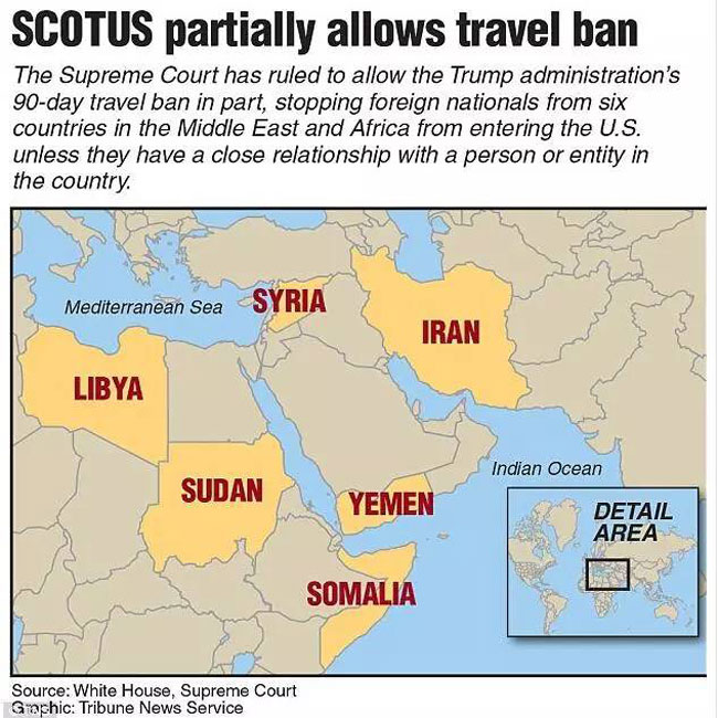6月26日,美国最高法院允许特朗普的旅行禁令部分生效,并将在今年秋季听取关于此案的口头辩论。