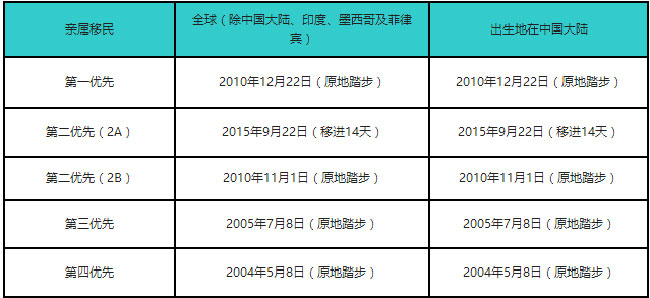 亲属移民8月“绿卡批准排期”,中国大陆出生申请人几乎原地踏步,具体情形如下:F-1类:保持在2010年12月22日,原地踏步;F-2A类:由2015年9月8日推进到2015年9月22日,移进14天;F-2B类:保持在2010年11月1日,原地踏步;F-3类:保持在2005年7月8日,原地踏步;F-4类:维持在2004年5月8日,原地踏步。