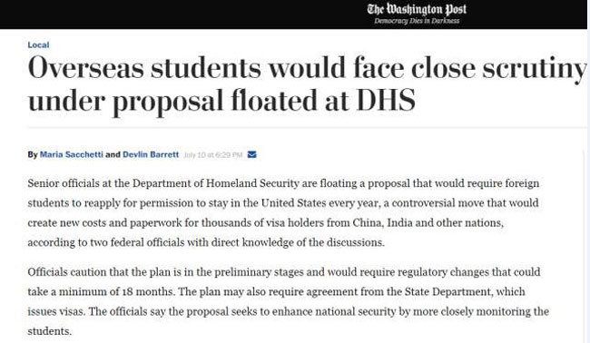 重磅消息!美国国土安全部(DHS)高级官员近日提交了一份“要求国际学生每年需重新申请美国签证”的议案,将留学生签证从现在的5年签证变成一年一签!