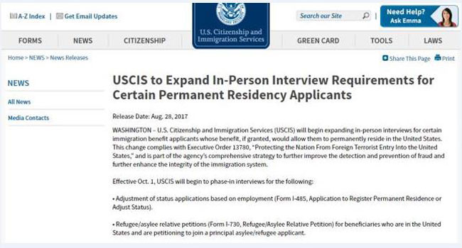 按照移民局的新规,从10月1日起,所有职业移民类别,从EB-1一直到EB-5类别,都将进行面试,通过之后才能发放绿卡。移民局还将逐步加大移民面试申请的实施范围。