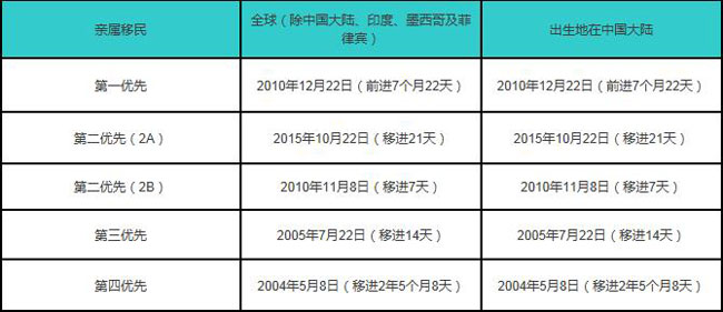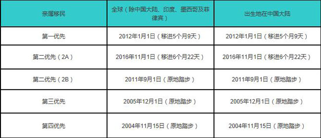 亲属移民10月“绿卡批准排期”,中国大陆出生申请人全部前进,具体情形如下: