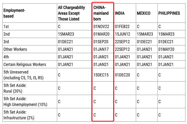 根据最新排期表,中国大陆出生申请人职业移民表A (Final Action Date):