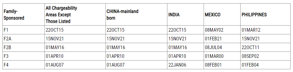根据最新排期表,中国大陆出生申请人亲属移民表A (Dates for Filing):