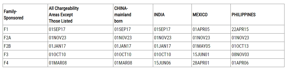 2024年7月亲属移民表B中,中国大陆出生及全球(含港澳台地区)申请人,仅在F2-A及F3类别排期中分别有所前进。亲属移民表B开放。