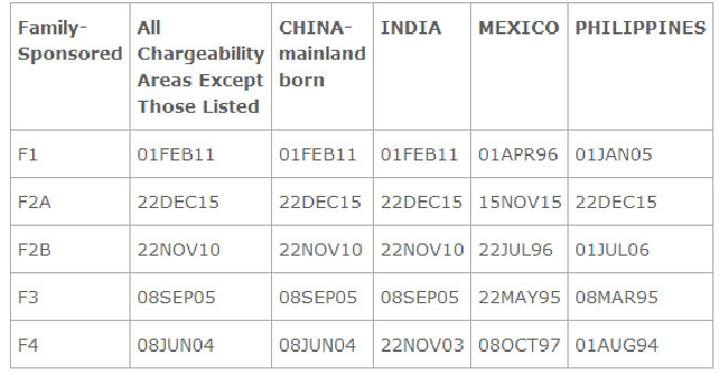 11月14日,美国国务院签证办公室发布了12月的签证排期公告,亲属移民和职业移民的排期表A全部前进。亲属移民“绿卡批准排期”,中国申请人的情况为——F-1类:由2011年1月22日前进到2011年2月1日,移进10天;F-2A类:由2015年11月15日前进到2015年12月22日,移进1个月7天;F-2B类:由2010年11月15日前进到2010年11月22日,移进7天;F-3类:由2005年8月15日前进到2005年9月8日,移进24天;F-4类:由2004年5月22日前进到2004年6月8日,移进17天。职业移民“绿卡批准排期”, 中国申请人的情况为——EB-1有名额;EB-2移进15天至2013年7月1日;EB-3移进1个月8天至2014年3月8日;EB-4有名额;EB-5移进14天至2014年7月15日。