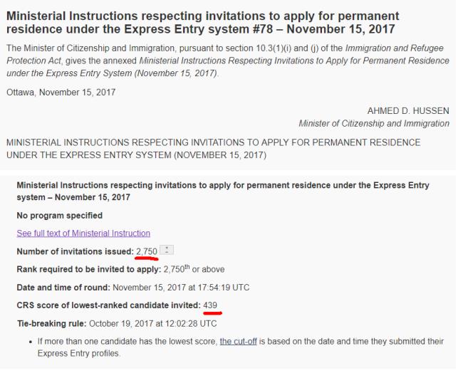 当地时间11月15日,Express Entry进行了第78轮邀请(今年第28次)。本轮最低邀请分数439分,邀请人数2750人。相较第77轮邀请,本次的最低分数下降了19分,获邀人数则增加了750人。