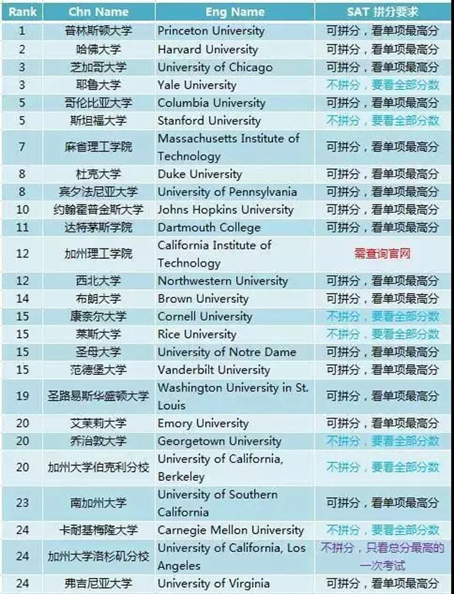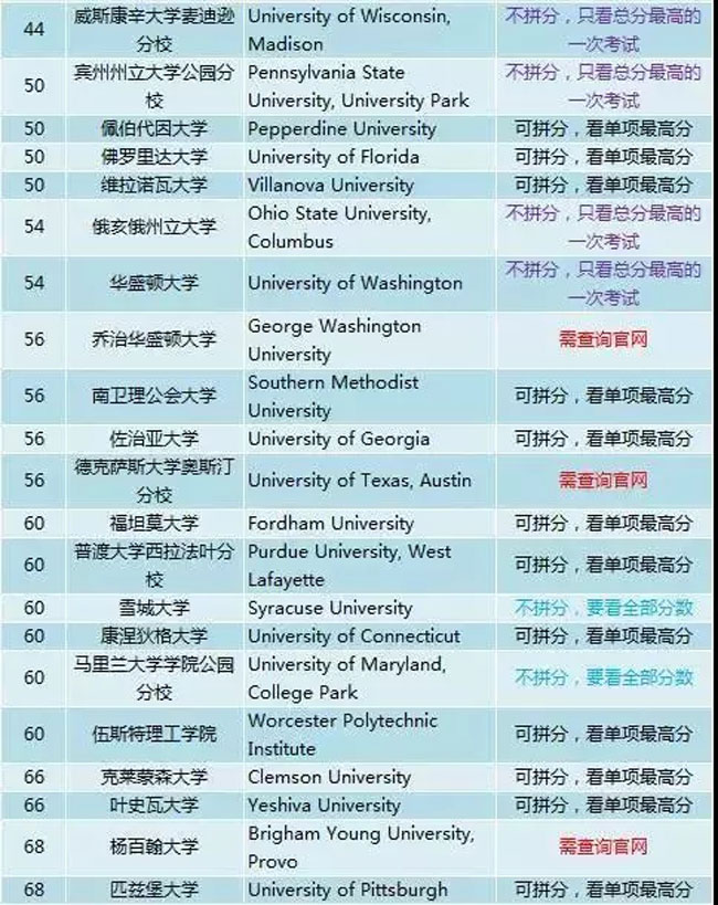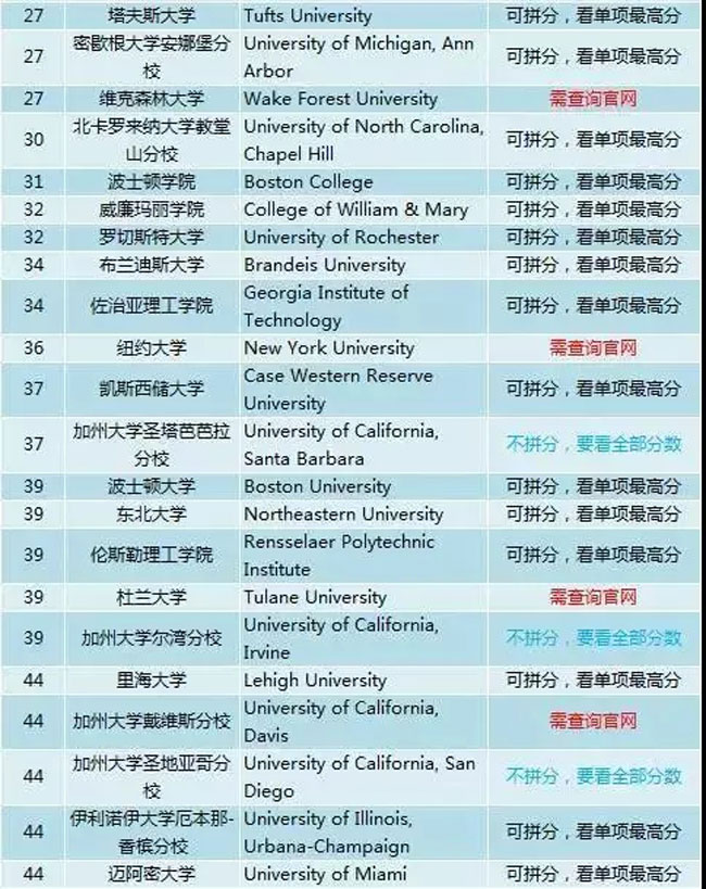 随着EA/ED申请的结束和加州系申请截止日期在即,越来越多的申请人发现“分到送时方恨少”,对大学来说,由于录取新生的平均SAT成绩也是考察大学排名的重要指标,所以许多美国大学也很乐于采用拼分政策来增加新生平均分。究竟美国哪些大学接受拼分,拼分规则又如何?2018年TOP100大学SAT拼分要求总表