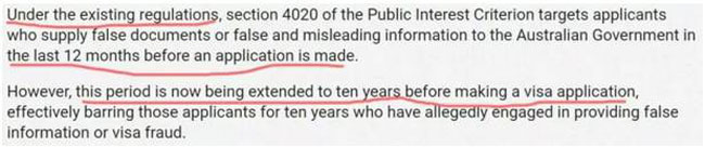 澳洲移民局公布移民条例修改法案,修改法案里面影响最大的是对涉及申请材料造假的PIC 4020条款的修改。该条例于11月18日开始执行。本次变更主要是两点:(1)申请者在签证申请中或者递交新签证之前的12个月变更成为了10年内持有的签证里面如果提供了虚假的文件或者信息,都将不满足PIC 4020条款。(2)之前可在28天内对移民局认为造假的材料进行解释,如果解释通过或者撤掉这个签证申请的话,则不再追溯。但是11月18日后,哪怕你撤掉了签证申请,在以后的签证申请也会受4020条款限制。也就是如果你只要过去10年递交的签证申请里面有提交假的材料和信息都会不满足4020要求。