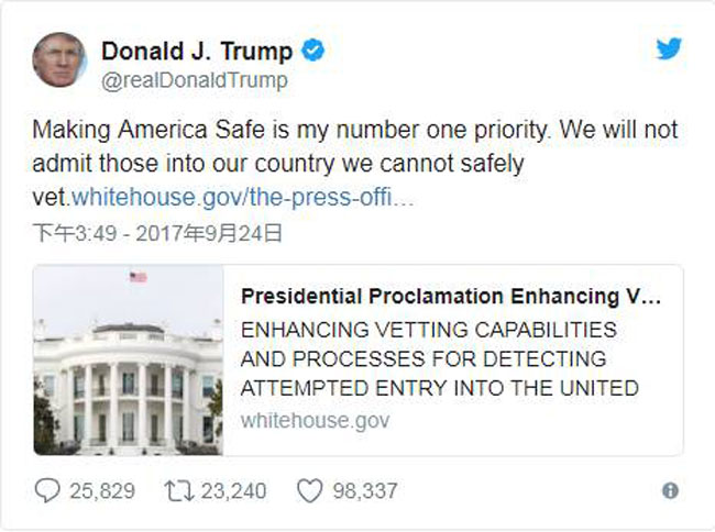 在签署之后,川普发推特表示:“让美国安全是我的首要任务,美国不会允许无法安全筛查的人员进入。”