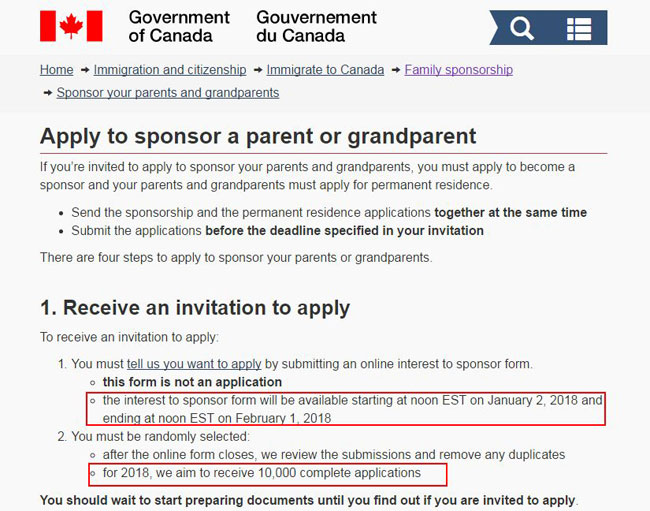 加拿大东部时间2018年1月2日中午12时,移民部正式发布“担保意向” (Interest to Sponsor)申请表格,这份表格的有效期截止到东部时间2018年2月1日中午12点。想要担保父母、祖父母移民的加拿大公民或永久居民,需在此期间递交申请,然后参加随机抽签,被抽中的申请者将会获得移民部的邀请函,有机会申请移民。担保人条件:加拿大担保人必须年满18周岁,必须有足够的经济来源且达到移民部规定的最低收入标准。担保人经济收入计算标准:移民部规定的收入标准每年2月公布,有效期为一年,每年会根据通货膨胀进行一定地调整;可以用于担保的收入一般指从入选时间往前推三年的全部税前收入,假如担保人有配偶也可以作为共同担保人,其收入则可以纳入这个总金额。担保人最低收入要求:家庭团聚的人数一般包括担保人本人,担保人配偶及其子女加上被担保的父母及领养的子女。申请费用:(1)政府费用$550加币每个人;(2)登陆费$490加币每个人 (申请通过后再递交)