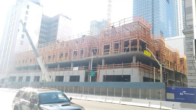 ▲1区与2区的楼梯塔已搭建,第3、4层楼层的木质架构工程正在进行中