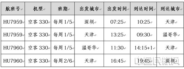 当地时间1月23日,加拿大温哥华国际机场正式宣布,首个直飞温哥华-深圳/天津航线的航班将在5月25日开通。执飞这个航班的公司是海南航空公司。该航线每周一、五开通两班,航班号HU7959,深圳出发时间为早7时25分,10点25飞经停天津,在温哥华时间早上9点30到达温哥华机场。从温哥华出发的航班号为HU7960,早11点30起飞,在下午2点15分抵达天津,晚7点45分抵达深圳。