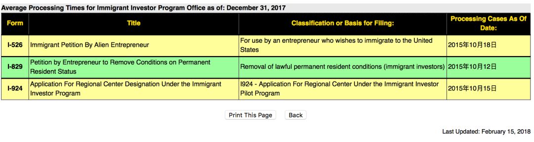 当地时间2月15日, 局发布了2017年12月份的最新EB-5审案进度。比起上一个月,I-526倒退55天,I-829倒退12天,I-924倒退13天。12月平均审案时间:(1)I-526审批需要26.5个月;(2)I-829审批需要26.5个月;(3)I-924审批需要26.5个月。审案截止日:(1)I-526申请审案截止时间2015年10月18日;(2)I-829申请审案截止时间2015年10月12日;(3)I-924申请审案截止时间2015年10月15日。