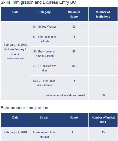 当地时间2月14日,BCPNP技术类别公布最新抽选结果:(1)EEBC 技术移民,获邀分数为80分(比上轮提高5分);(2)EEBC 国际学生,获邀分数为75分(比上轮提高5分);(3)普通类别BCPNP技术移民,获邀分数为80分(比上轮提高5分);(4)普通类别BCPNP国际学生,获邀分数为75分(比上轮提高5分);(5)普通类别BCPNP低技术半技术,获邀分数为40分。当地时间2月21日,企业家类别公布最新抽选结果:获邀人数为15人,获邀分数为115分。这两轮抽选共发出339份邀请,获邀人数比上期少了近50人。