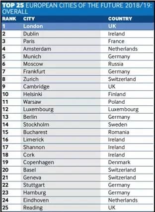 十四.欧洲未来城市排名,都柏林位列前三甲