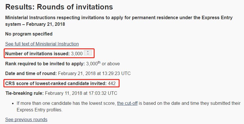 当地时间2月21日,Express Entry进行了第84轮邀请,不分职业,不分类别(本轮没有单独区分省提名技术移民PNP和FST联邦技工移民类),本轮最低邀请分数442分,邀请人数3000人。相较上一轮邀请,获邀分数和获邀人数均持平。如果刚好442分的人数不止一人导致候选人超过3000人,那么同为442分的候选人根据进入池子的先后顺序决定是否被邀请。从2018年EE获邀情况可以看出,加拿大已经在逐步增加配额,并且增加配额的同时分数也在逐步下调。