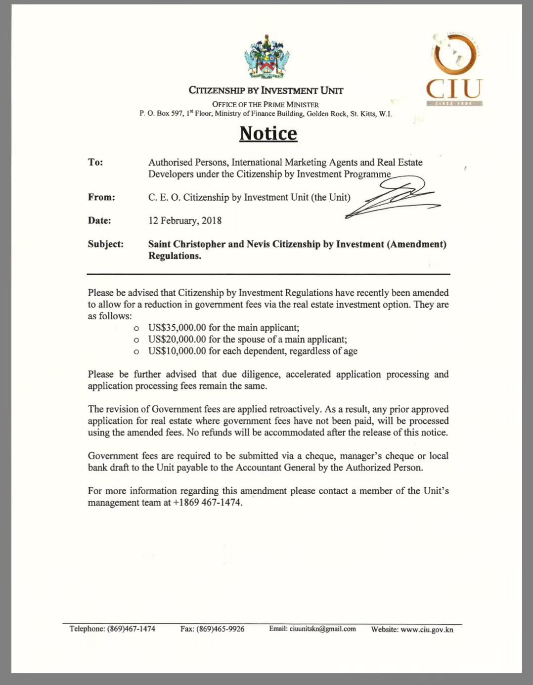 近期,圣基茨移民局官网公布了房产投资移民项目政府申请费下调的消息:(1)主申请人由原来的5万美金下调到了3.5万美金;(2)配偶由原来的2.5万美金下调到了2万美金;(3)变化最大的当属其他附属申请人(包括主申请人的子女、父母等)项,由原来的不同年龄不同收费标准变为现今不计年龄1万美金/人。根据新政策,一家四口通过投资房地产方式申请入籍圣基茨,政府申请费仅为3.5万+2万+1万*2=7.5万美元,比旧法案的政府申请费至少降低5万美元。需要注意的是,以上新法案暂未规定有效期,直至下次法案变更一直有效,对于通过房地产方式申请入籍圣基茨的投资者而言,只要政府申请费还未支付,就可以按照本次新法案执行。