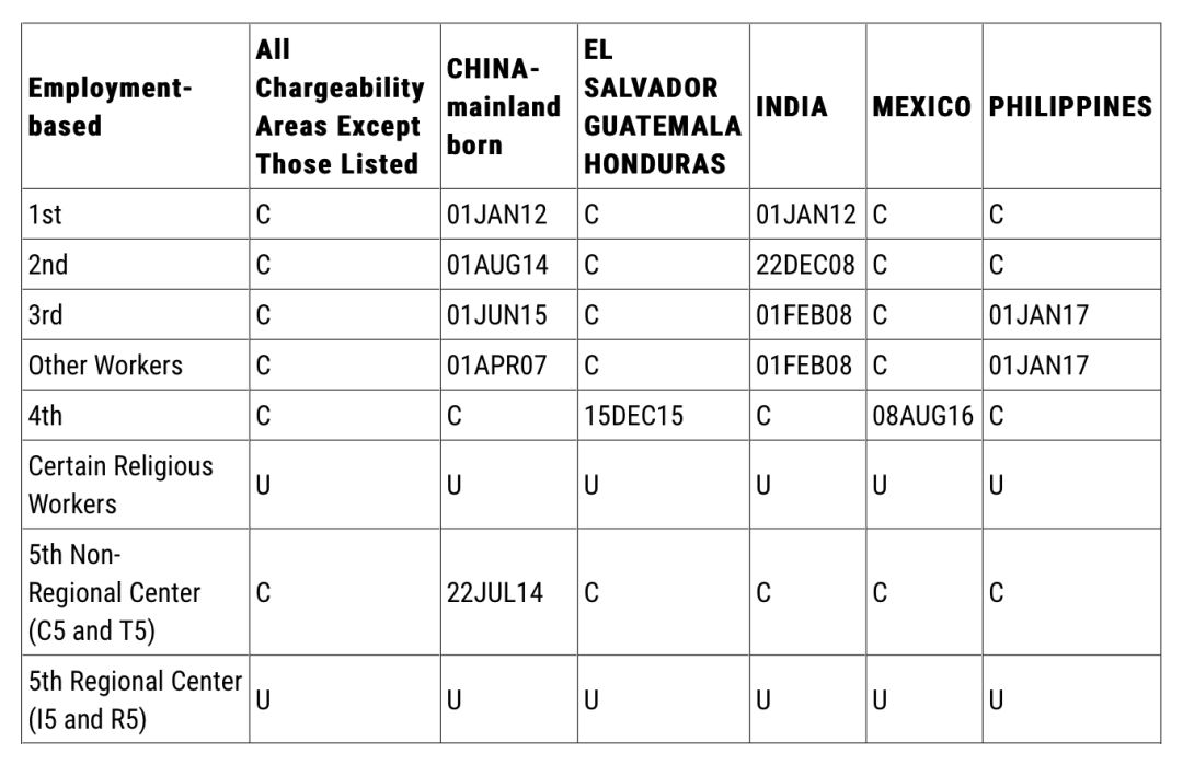 中国大陆出生申请人,EB-1本财年首次排期,大幅倒退至2012年1月1日;EB-2由2013年12月8日前进到2014年8月1日;EB-3由2014年11月15日前进到2015年6月1日;EB-4有名额;EB-5保持在2014年7月22日。