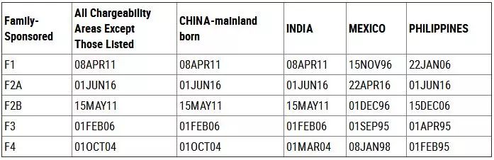 4月11日,美国国务院签证办公室发布了5月的签证排期公告,EB-5签证排期截止日和表B同样原地踏步。亲属移民“绿卡批准排期”,中国申请人的情况为——F-1类:维持在2011年4月8日;F-2A类:由2016年5月1日前进到2016年6月1日;F-2B类:由2011年4月8日前进到2011年5月15日;F-3类:由2006年1月8日前进到2006年2月1日;F-4类:由2004年9月15日前进到2004年10月1日。职业移民“绿卡批准排期”,中国申请人的情况为——EB-1维持在2012年1月1日;EB-2由2014年8月1日前进到2014年9月1日;EB-3维持在2015年6月1日;EB-4有名额;EB-5保持在2014年7月22日。