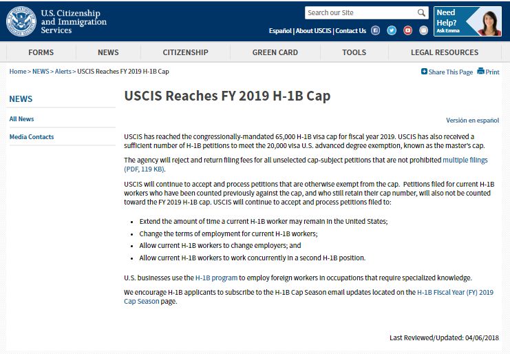 当地时间4月11日, 局已经完成了2019财年的H-1B抽签。从4月2日开始,移民局共收到190,098份H-1B申请,其中包括硕士及以上高学历的豁免名额的申请。4月6日,移民局就宣布收到的H-1B申请已经满额。移民局将开始拒绝和退回未中签的申请以及申请费,但重复递交的申请不但不会中签,移民局也不会退还申请费。此次,移民局依然是先从硕士及以上学历的申请中抽出2万个高学历豁免名额。而未被抽中的申请人则与剩下的其他申请人一起竞争6.5万个名额。移民局将继续接收不受名额限制的申请,以及此前已经中签的H-1B员工的延期申请、H-1B员工更换雇主申请等。
