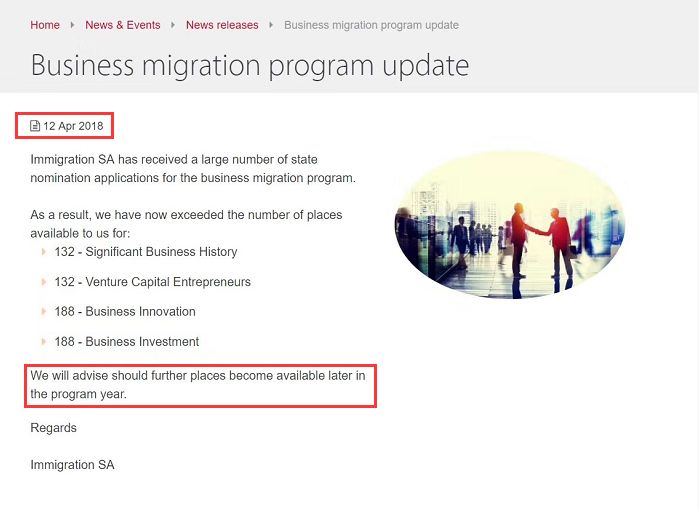 当地时间4月12日,南澳州政府宣布州担保申请系统升级完成并恢复网上申请通道。暂停了三个月的南澳188与132签证重新开放申请,但配额仅用不到4个小时就被抢完了。根据州政府最新发布的消息,由于收到大量的申请,其人数已经超出原限定名额,所以决定暂停接收以下州担保商业移民签证类的申请:(1)132-Significant Business History显著经商历史;(2)132-Venture Capital Entrepreneurs风险投资企业家;(3)188-Business Innovation商业创新;(4)188-Business Investment商业投资。抢不到配额的投资人须等到7月1日新财年配额出来后才能再递交申请,具体时间南澳州政府会再进行通知。