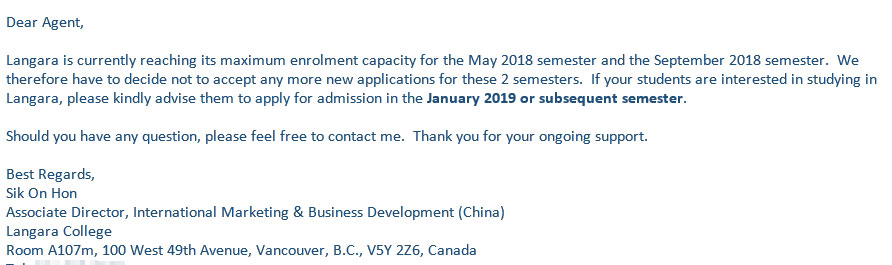 近期,温哥华兰加拉学院(Langara College)发出的正式通知中表明,确认各直录专业将暂停在2018年5月和2018年9月两个学期招收国际留学生,今年7月、9月、11月开学的语言双录取专业(LEAP + Target program)目前仍然开放。另外,道格拉斯学院(Douglas College )也发出类似通知,由于学校接纳国际留学生的数量有限,今年又收到了非常多的申请,学院将于近期暂停接收国际留学生在2018年9月入学的申请,具体时间待定,希望没有提交申请的同学在这几天尽快提交申请。