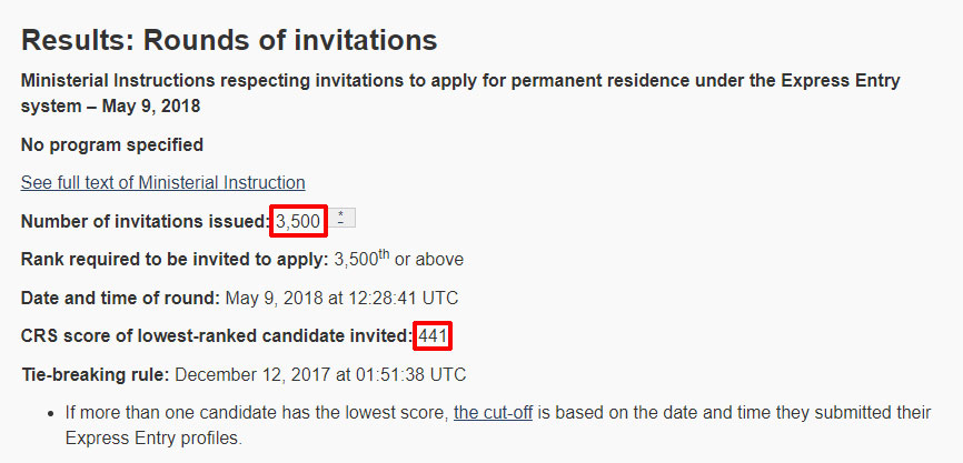 当地时间5月9日,Express Entry进行了第89轮邀请,不分职业,不分类别,本轮最低邀请分数441分,邀请人数3500人。相较上一轮邀请,获邀分数和获邀人数均持平。根据移民局5月4日提供的数据,分数在441-450分之间的只有992人,算上之后入池的候选人,也不会逼近3000人。由此预测,本次抽选的3500人里有非常之多的获邀人都是有省提名加分的。2018年EE计划邀请数量为74900人,目前总共邀请了28000人。而在2017年,EE目标邀请数为71700个申请,而实际总共发放了86023个申请。