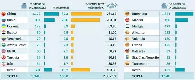 随着西班牙房产持续回暖,外国投资者纷纷涌向这块投资宝地,通过购房换居留的申请人更是在近一年内爆增。据Cinco Días数据统计,截止2017年年底,投资移民领域签证数量一共为3350份。这部分签证持有人在西班牙已经投资了30.26亿欧元,数额大大高于2016年的17.08亿欧元。投资领域主要集中在房地产,投资总额高达23.32亿欧元,占投资总资本的77.1%。办理购房移民的投资者大多数是中国人与俄罗斯人。据统计,房产投资类中国投资人数量占37.3%,排名第一;其次是俄罗斯人占比32.6%;中国人与俄罗斯人主要的投资方式是房产投资,占投资移民总量的63.9%。