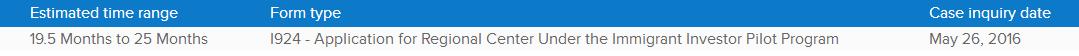 自3月23日 局公布新版审案进度表以来,预计的审案时间就一直没有发生变化,直到5月31日,预计的审案时间终于有了更新。截至6月11日,EB-5审案进度:(1)I-526预计的审案时间为20-25.5个月,案件查询日期为2016年5月11日。(2)I-829预计的审案时间为29-37.5个月,案件查询日期为2015年5月17日。(3)I-924预计的审案时间为19.5-25个月,案件查询日期为2016年5月26日。